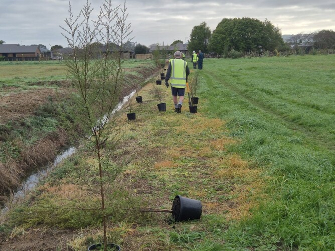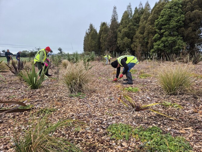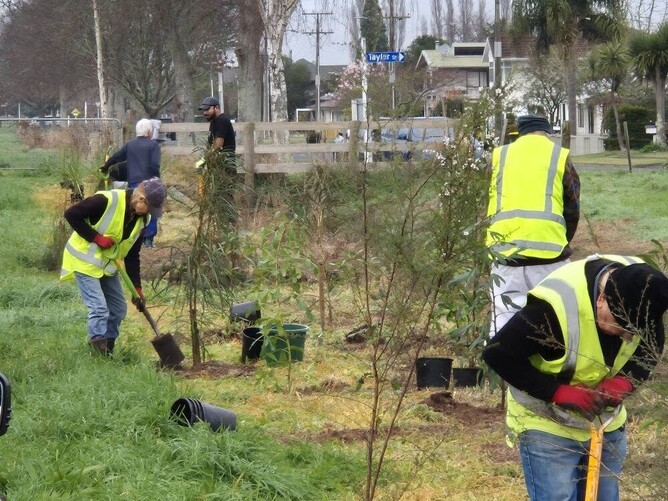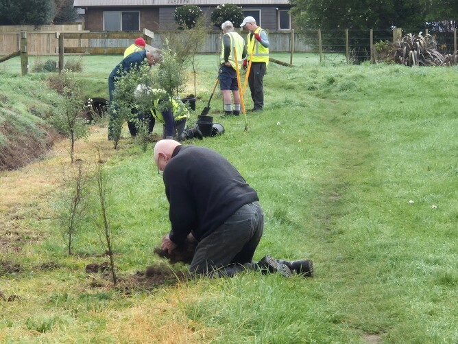 Tuesday, 1st July 2025. Today we planted the edge of a drain that the council had cleared of a good many difficult weeds, including a lot of blackberry and gorse. It's been sprayed and the first trees are going in. There are more to come on the other side of the drain and later, there will be infill planting with smaller trees and shrubs. There were a lot of us here today. Usually school holidays result in a shortage as our members go on grandparent duty minding children, but not this time. We got through the job in ¾ of an hour, then went on to deal with weeds and plastic in the kahikatea grove.