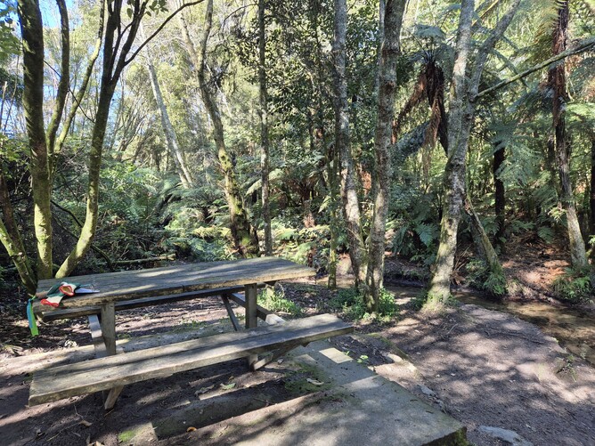 It's a very nice place, as many people have found. Someone has installed a rope to swing out over the little stream that flows through it. Someone has built a couple of rough dams to make swimming holes, and BMX people have made an elementary track with some jumps. There are seats and a picnic table. There are several paths meandering through the trees, and then there is the long staircase up to the Leamingrton Cemetery.