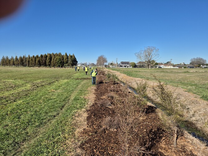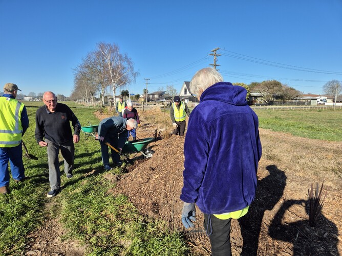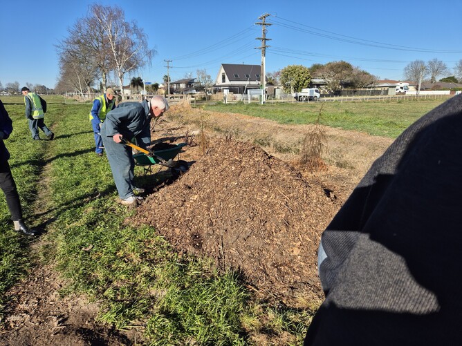 Spreading mulch at the drain by the Kahikatea Grove. The Council staff kindly left us some more mulch in heaps beside the drain. We spread all of it in an hour and a half. Again, a good turnout.