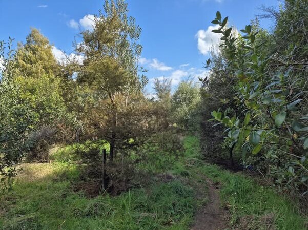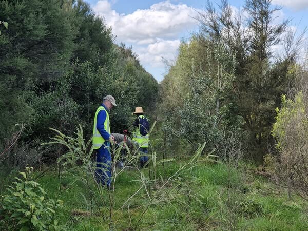 Tuesday, 26th August, and we finally got to the swale in Brian Mayo Reserve. We cleared vegetation from the bases of the trees so that we could spray, and checked the plastic ties that were supporting the smaller plants that we planted a couple of years ago. Growth has been spectacular, and what was a fairly open space between the expressway and the swale is now a leafy canyon. It appears from the tyre tracks that motorcyclists enjoy weaving in and out among the trees. It's a good obstacle course for them.