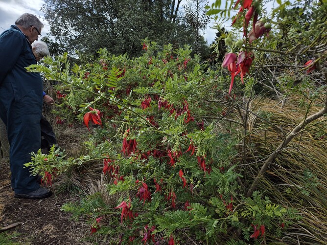 As usual, we weeded around the plants before spraying. The plants are growing well. The kauri are shooting skyward and the flaxes and other trees and shrubs are filling up the spaces nicely. The red kaka beak bushes are spectacular at the moment with their flowers in profuse display.