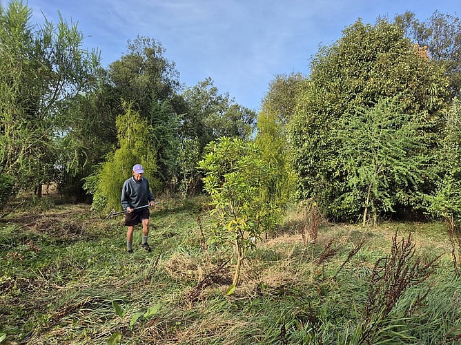 Thursday, 19 the March already, and we're paying attention to the Rimu Grove. We're cleaning out weeds and the ubiquitous privet and blackberry. The dry soil has sent some of the roots very deep in their search for water and weeding is therefore hard work. We were glad when morning tea time rolled around and we could enjoy our first Easter eggs of the year.