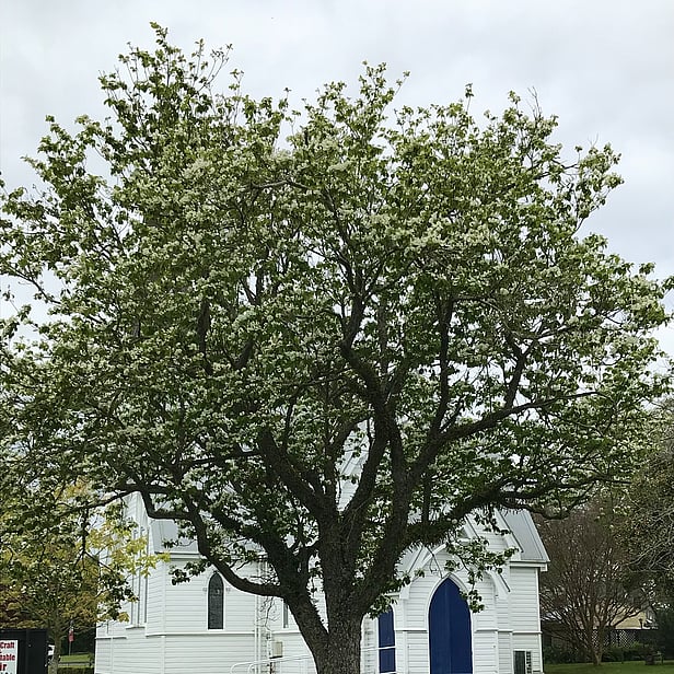 This attractive small tree stands in the grounds of St Andrews church. Blossoming in late spring when the tree is already in leaf, it is nevertheless beautifully showy when in bloom. However, what appears to be four white petals are actually four spreading bracts below a cluster of tiny, inconspicuous yellow-green flowers. In autumn the leaves turn a reddish colour, and the fruit is a pinkish-red compound berry about two or three centimetres across. Although the rind of the berry is bitter, the pulp is edible, with a flavour similar to a fully ripe persimmon. However, it contains several hard, inedible seeds which attach to the pulp and must be removed first. The berry has been used for making wine.