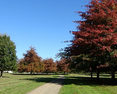 Having put up names for the various species that we had planted in the maple arboretum next door, we did the same here, with a post for each species. There are stainless-steel nameplates on each post, detailing the botanical name, the common name, the countries where they are native, and the date of planting (2003). Click here to visit Oaks of the World, a site with very detailed information on each species. It includes many more species than are found in this arboretum. (There are several hundred species of oak world-wide!)
